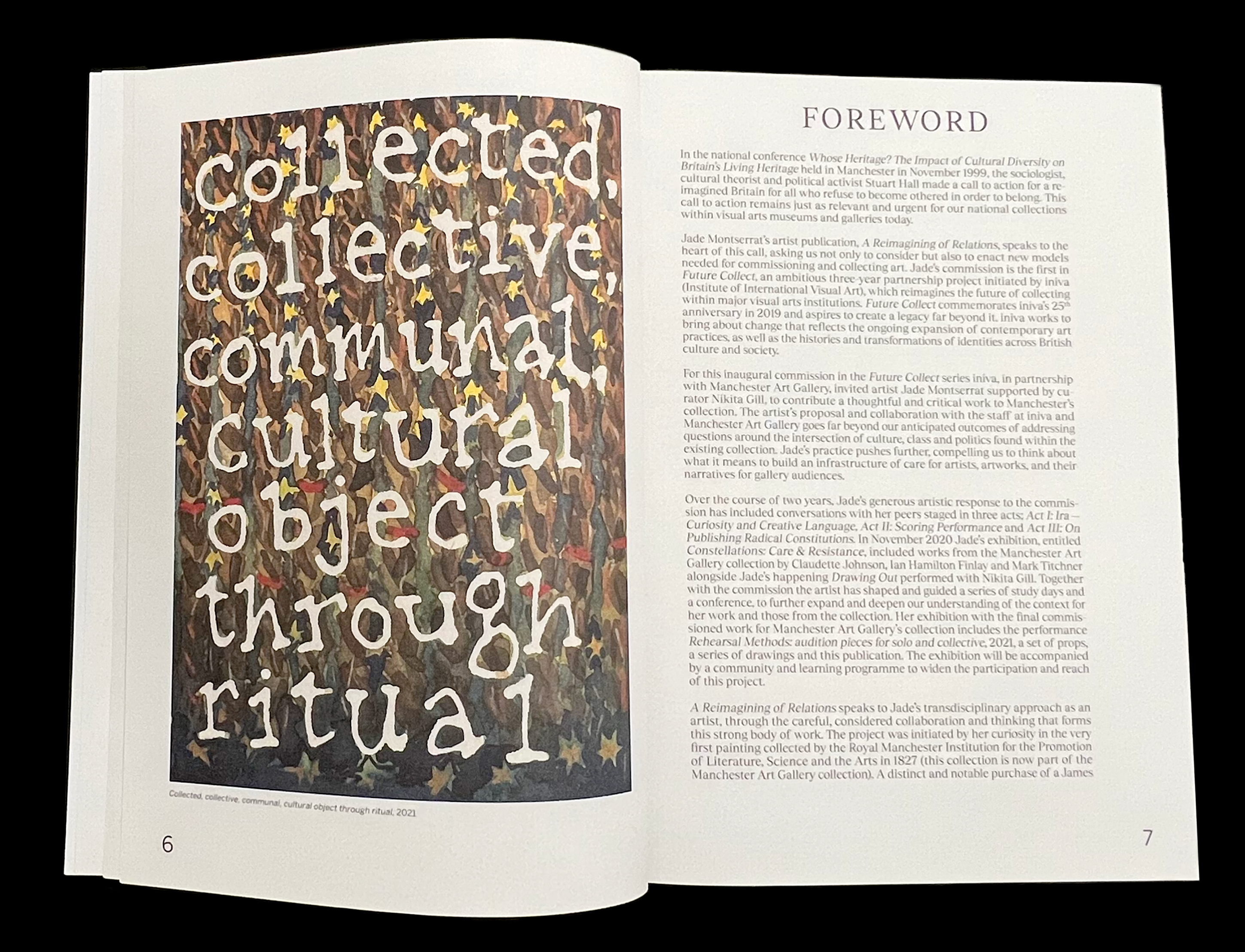 A Reimagining of Relations is an arist book conceptualised and designed for Jade Montserrat: “as part of her Future Collect commission with iniva and Manchester Art Gallery. This visually rich artist publication makes material the dialogue and ideas that have shaped Montserrat’s process over the past two years. Centring the conversations that have taken place between the artist and fellow creatives through the public programme associated with the commission, the publication also reveals her research and thinking around African American actor Ira Aldridge.”