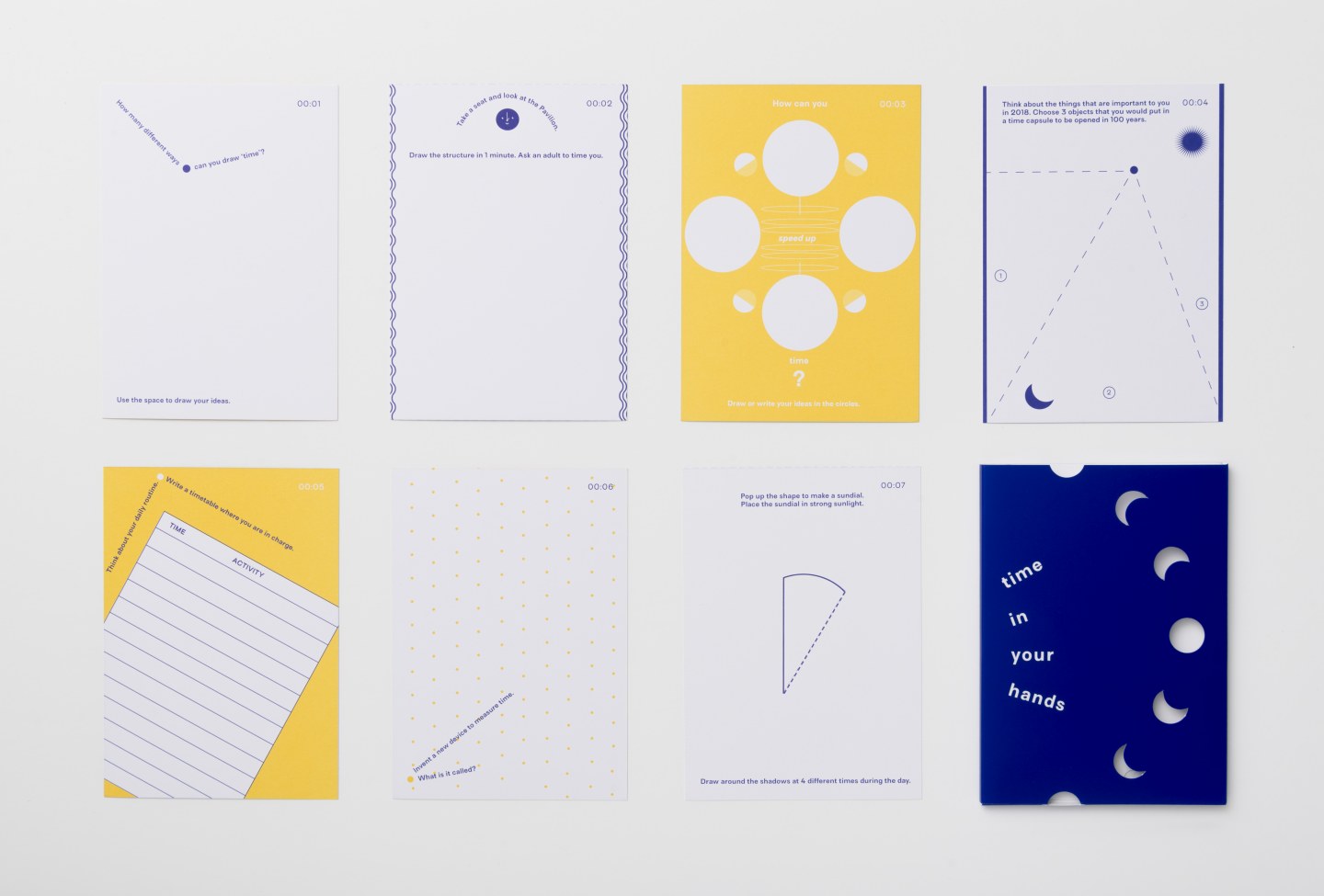 The series of designed prompt cards explore the theme of time through the roles of the sun and moon and the physical relationship of time on the Pavilion building (prompts written by artist and educator Sofia Niazi.)